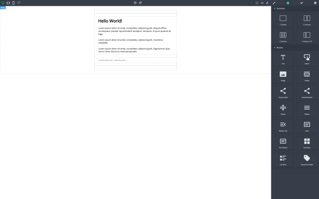 左侧菜单栏有四个按钮,向右依次为桌面模式、平板模式、手机模式和预览,我们可以选择对应的模式进行邮件样式编辑,模式之间的编辑效果是相互继承通用的;