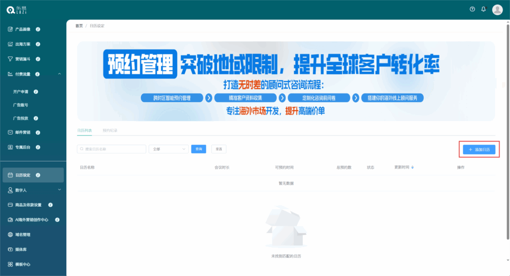 ①我们在左边的菜单栏点击【日历设定】,跳转到对应界面后,我们点击红框标记的“添加日历”蓝色按钮;