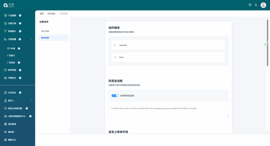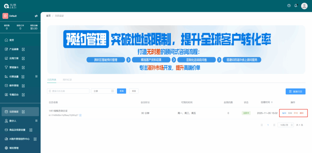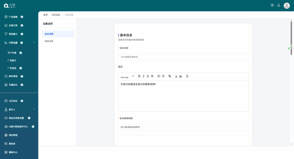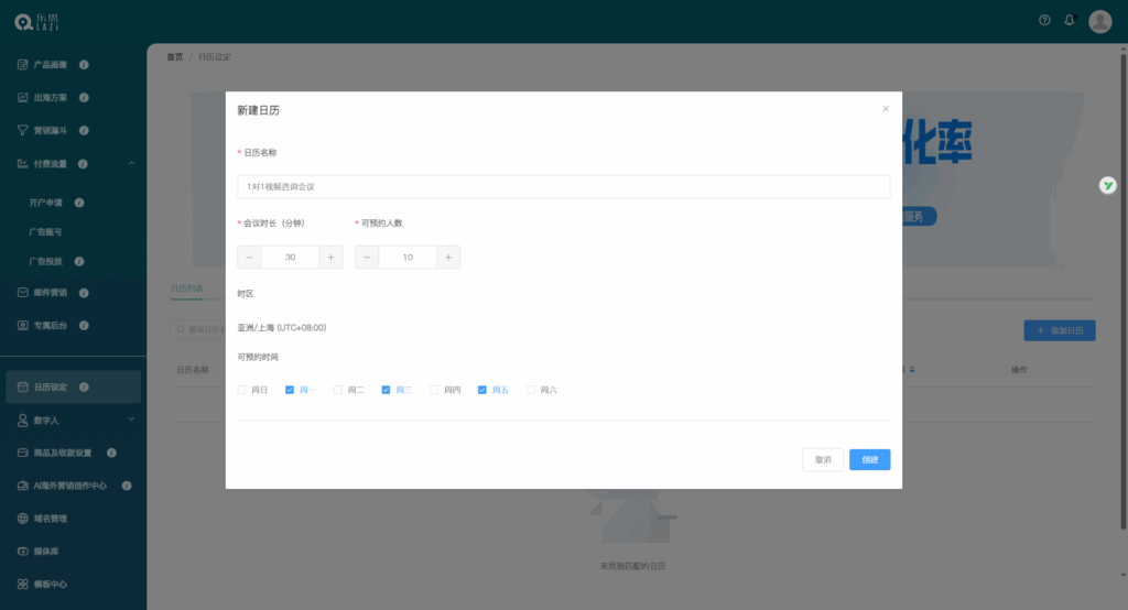 在海外营销过程中,我们有可能需要与客户进行1对1视频沟通或者会议等,这个时候就需要一个能给客户可预约的日程时间。以下是添加日历的具体操作: