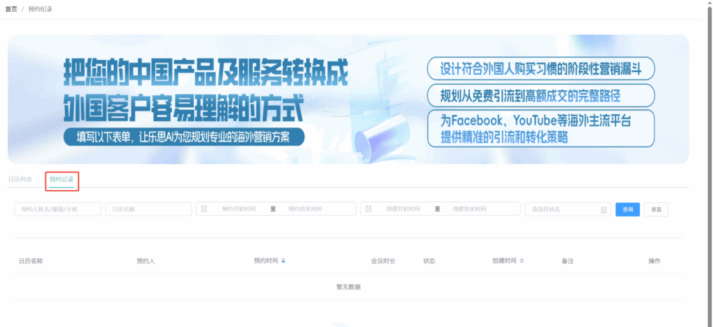 ⑥设置好日历后,可以静待客户预约,点击红框标记的“预约记录”可查看具体预约情况。
