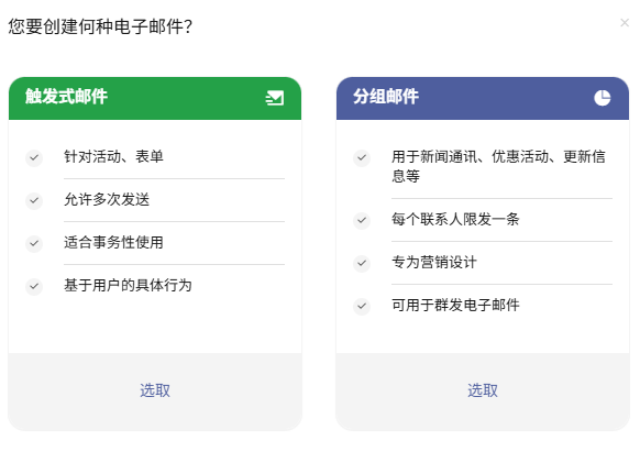 ②弹窗内可以选择想要创建的电子邮件类型,“触发式邮件”是根据客户与我们的互动行为情况进行发布的邮件内容,发送逻辑由事件触发决定,“分组邮件”是根据不同的客户分组进行群发的邮件内容,发送逻辑依据客户分组情况决定;