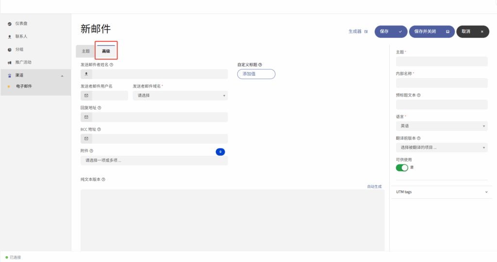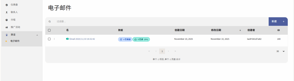 ①点击系统左侧菜单栏的【邮件营销】,在操作界面点击“渠道”内的“电子邮件”,在电子邮件界面点击红框标记的“新建”;