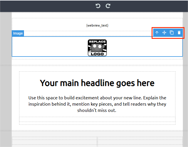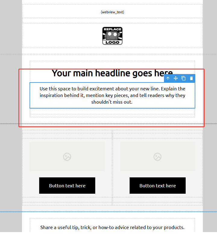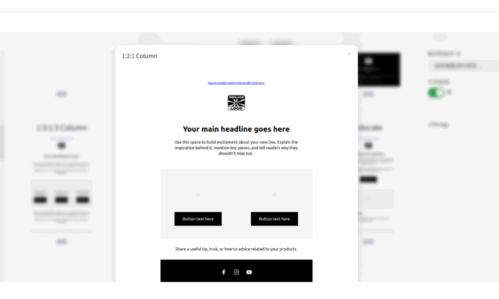 ⑥在邮件模版编辑界面,我们根据需求自行调整邮件的组成,右侧有不同的内容模块,长按鼠标左键可以把模块拖动至想要的位置再进行编辑;