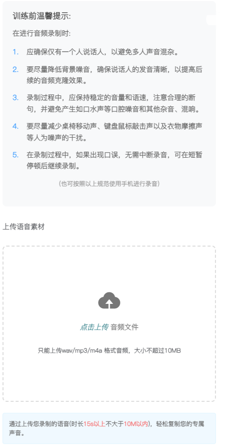 ②点击“添加声音”后,在弹窗补充信息和上传音频素材,点击确定即可生成克隆声音;