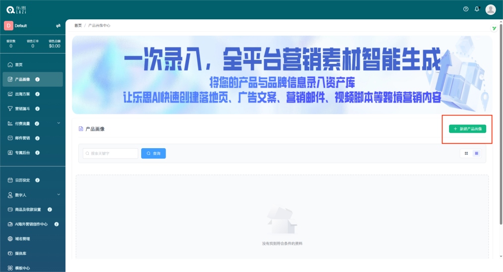 ②在【产品画像】界面,点击红框标记的“新建产品画像”按钮;
