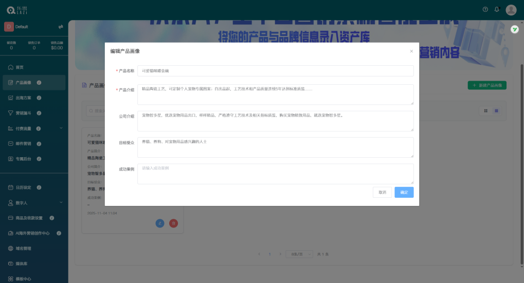 ③在填写信息的弹窗内,根据自己的产品信息去补充,点击确定即可生成一个【产品画像】;