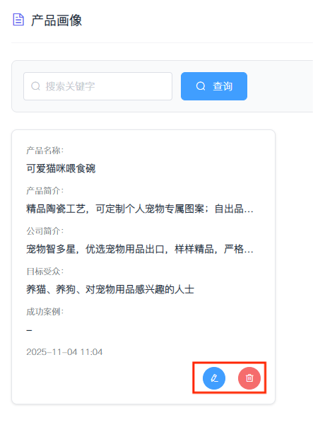 ④完成后界面可以查看到对应的产品画像信息,若不满意可点击蓝标进行编辑或点击红标删除。