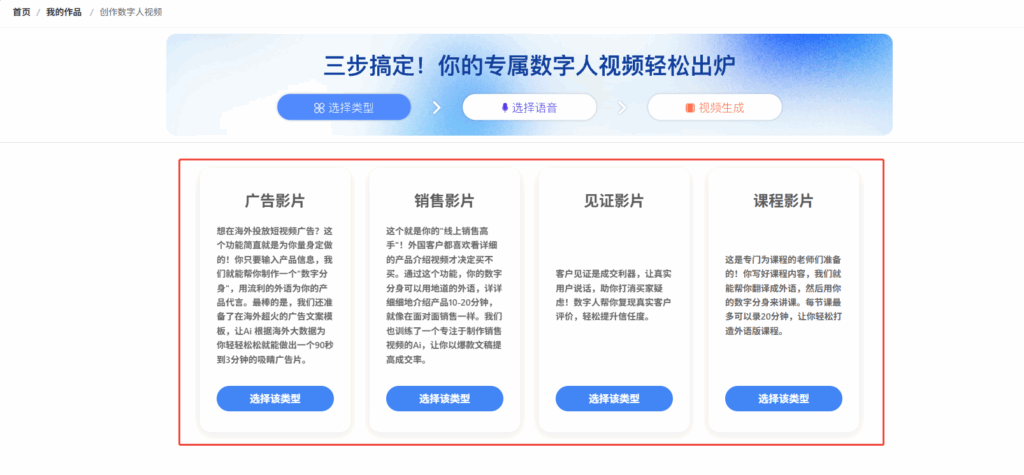 ②在创作数字人视频界面,选择我们要制作的视频类型;
