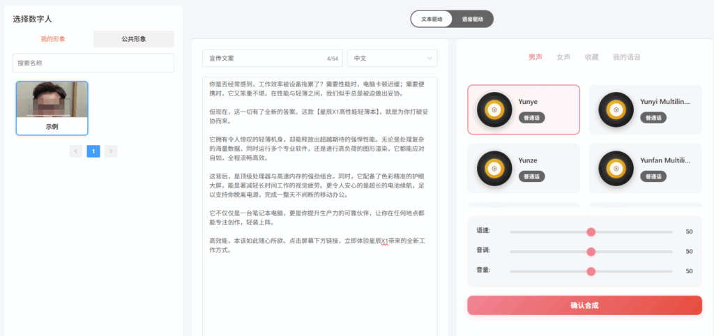 ③然后选择想要的数字人形象、想要的声音,给出朗读的文案,然后点击确认合成;