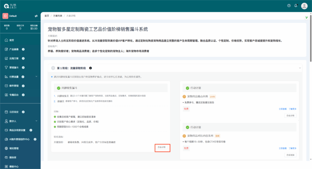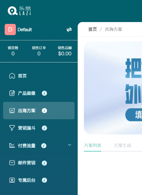 ①首先在系统左侧菜单栏点击【出海方案】跳转到操作界面;