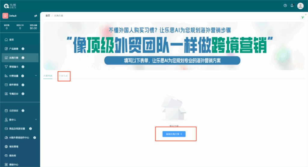 ②在界面内点击中间的蓝键“添加出海方案”,或点击上方的“方案生成”开始生成;