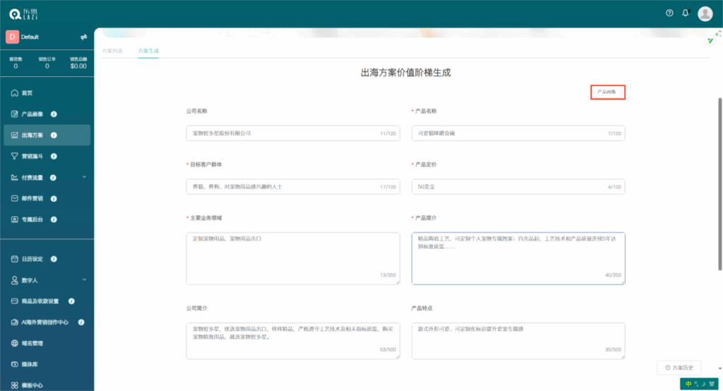 ③来到“出海方案价值阶梯生成”页面,把对应的信息填好,点击最下方的“生成方案”即可一键生成出海方案,如果前面已经完成了【产品画像】,我们点击界面红色标记的地方,可把产品信息直接添加进来;