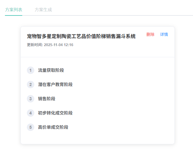 ⑦完成生成的出海方案,会在“方案列表”标签栏里显示,我们可以点击“删除/详情”对方案进行处理。