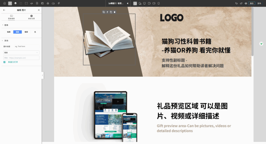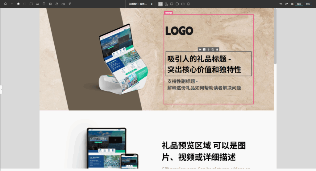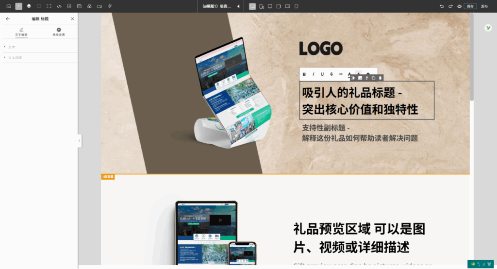 ②经过短暂加载后,进入落地页的编辑界面,为了降低大家设计落地页的门槛,编辑器用一系列的“容器”做了模块固定,我们只要找到相应的图片或文本进行修改即可;