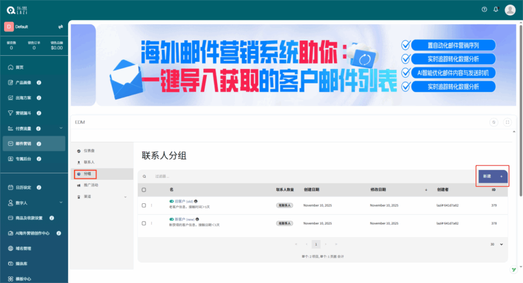 ①点击系统左侧菜单栏【邮件营销】,在操作界面选择“分组”,在界面点击“新建”;