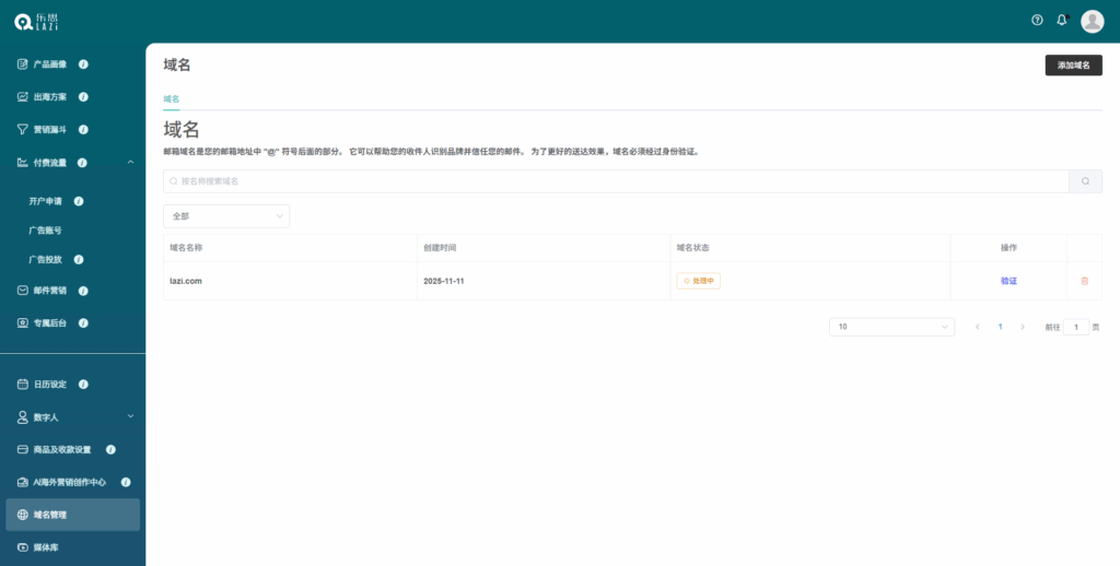 ①点击系统左侧菜单栏里的【域名管理】,在界面内可以看到当前创建的域名以及它们的状态,点击右上角“添加域名”可以增加新的邮件域名;