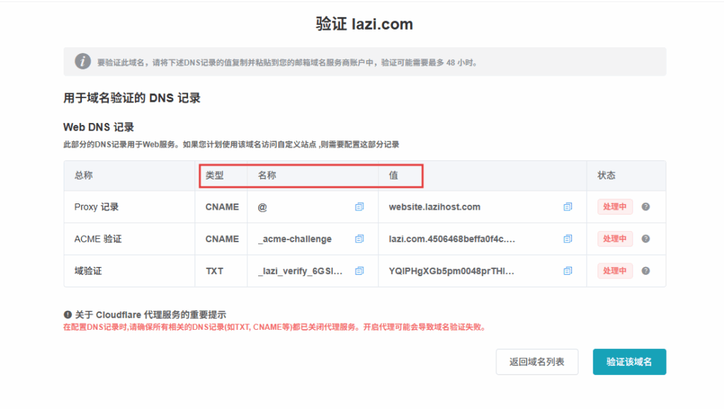 ③在验证页面可以看到域名当前的状态,验证域名请将下述DNS记录的值复制并粘贴到邮箱域名服务商账户中,验证可能需要最多 48 小时。