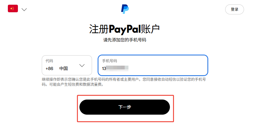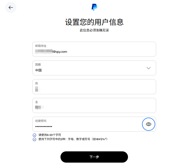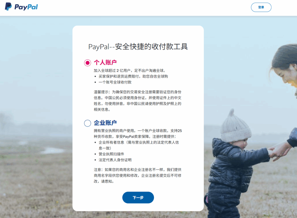 ①在PayPal官网(https://www.paypal.com/)点击注册,选定账户类型后点击下一步;