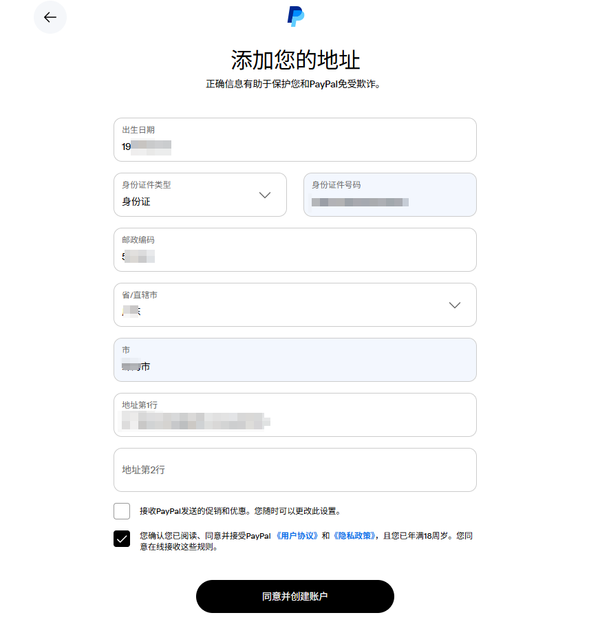 ④继续补充对应的用户身份信息,完成后点击“同意并创建账户”;