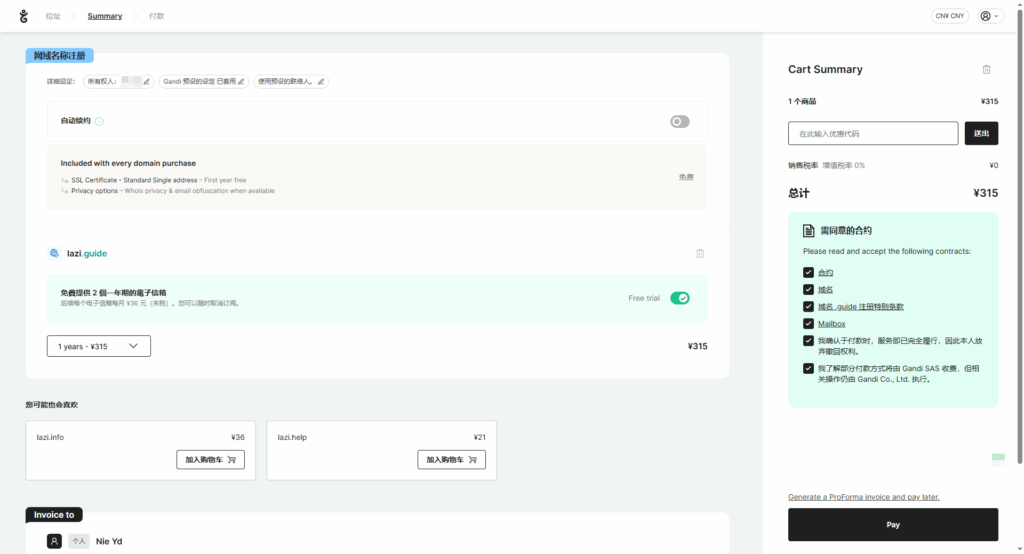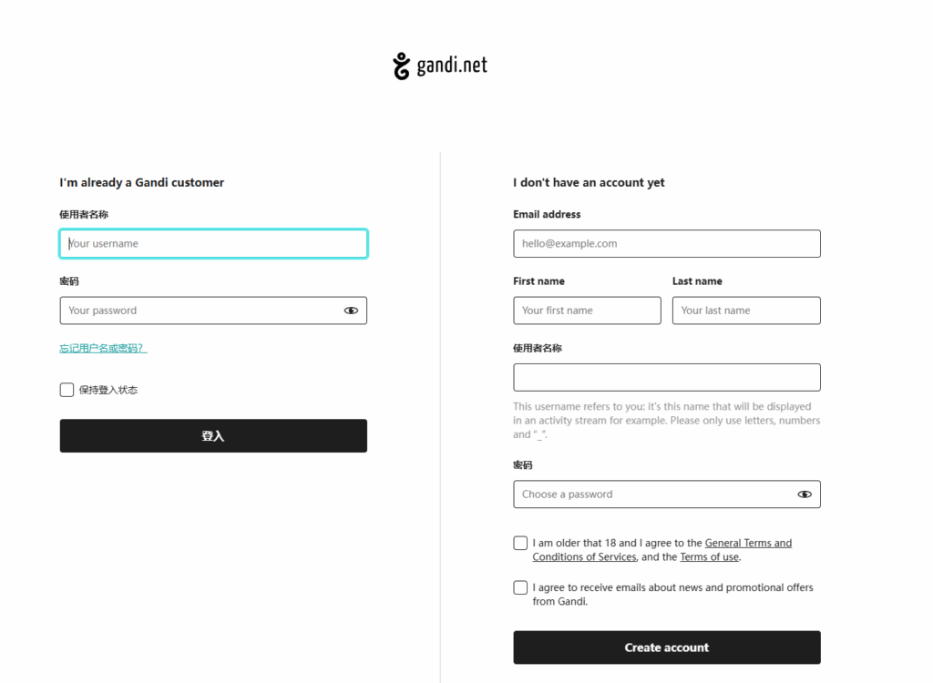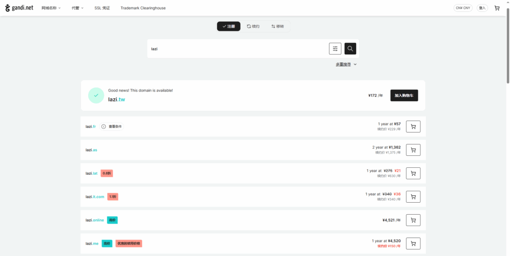 为了营销漏斗落地页的正常使用,我们需要到域名供应商购买域名,用于后面绑定落地页。这里以gandi平台购买域名为例,以下是具体的操作步骤:
