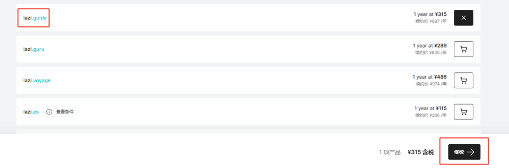 ③以红框标记的域名为例,点击右侧的购物车按钮,然后点击下方红框标记“继续”按钮;