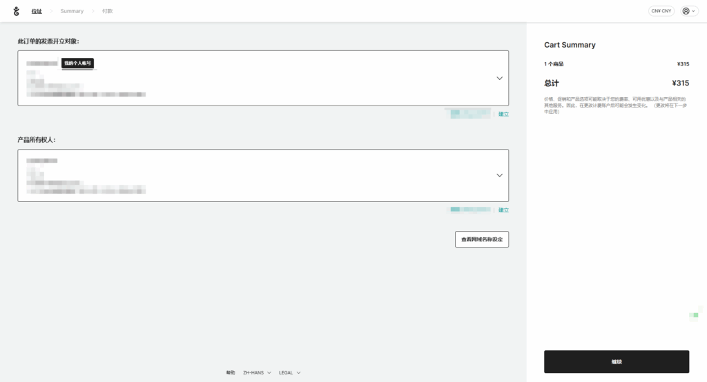 ⑥确认订单信息和产品所有权信息无误,点击“继续”;