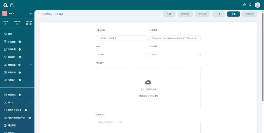 ①在营销漏斗编辑界面,红框标记处有两个“设置”,分别针对落地页和漏斗的设置;