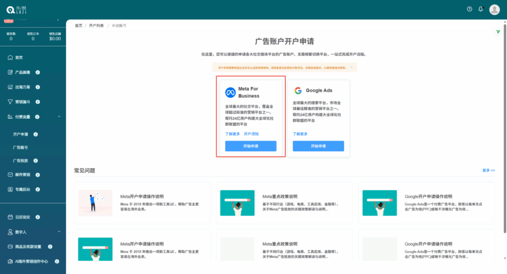 利用乐思系统【付费流量】功能,可以进行Facebook和Google两大广告体系的推广。使用广告投放功能前,我们需要开设广告账户。以下是乐思系统内开设Meta广告账户的具体步骤: