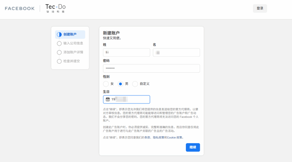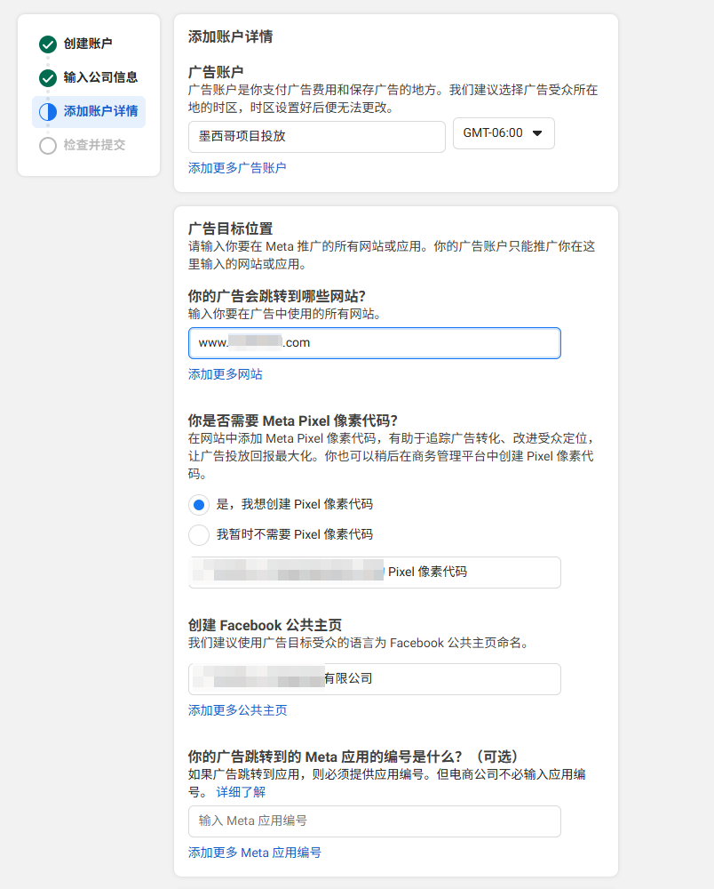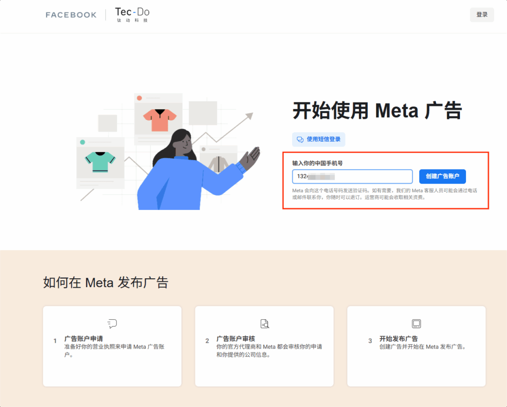 ③进入Meta广告开户页面后,输入手机号,点击创建广告账户;