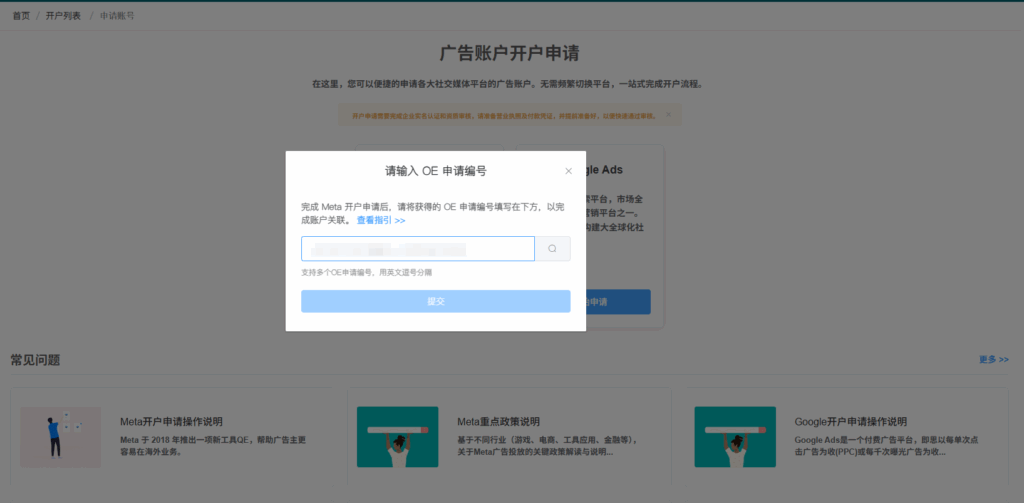 ⑥完成Meta开户申请后,输入账户对应的OE申请编码即可完成绑定。