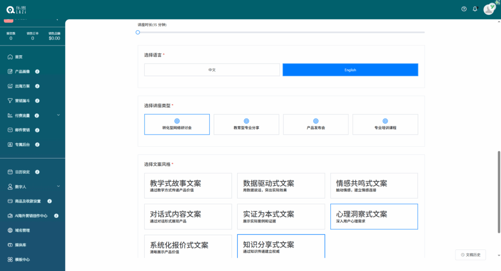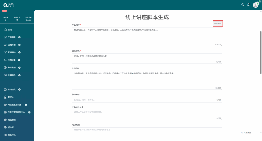 ①在系统左侧菜单栏点击【AI海外营销创作中心】,选择【线上讲座脚本生成】;