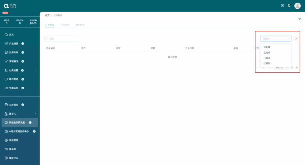 ①点击系统左侧菜单栏【商品及收款设置】,在订单列表可以查看订单的详情信息;